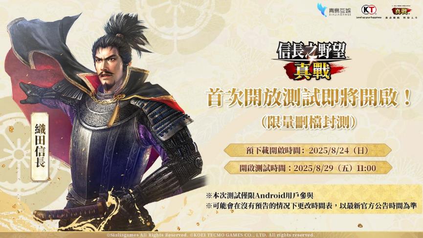 由光榮特庫摩《信長之野望·新生》正版授權、《三國志·戰略版》製作團隊打造,青鳥互娛代理的《信長之野望 真戰》今(25日)正式宣布,遊戲即將在8月29日展開「首次開放測試(CBT測試)」,並會以限量付費刪檔測試的形式登場。今日已開放預先下載,Android用戶可以搶先做好準備。