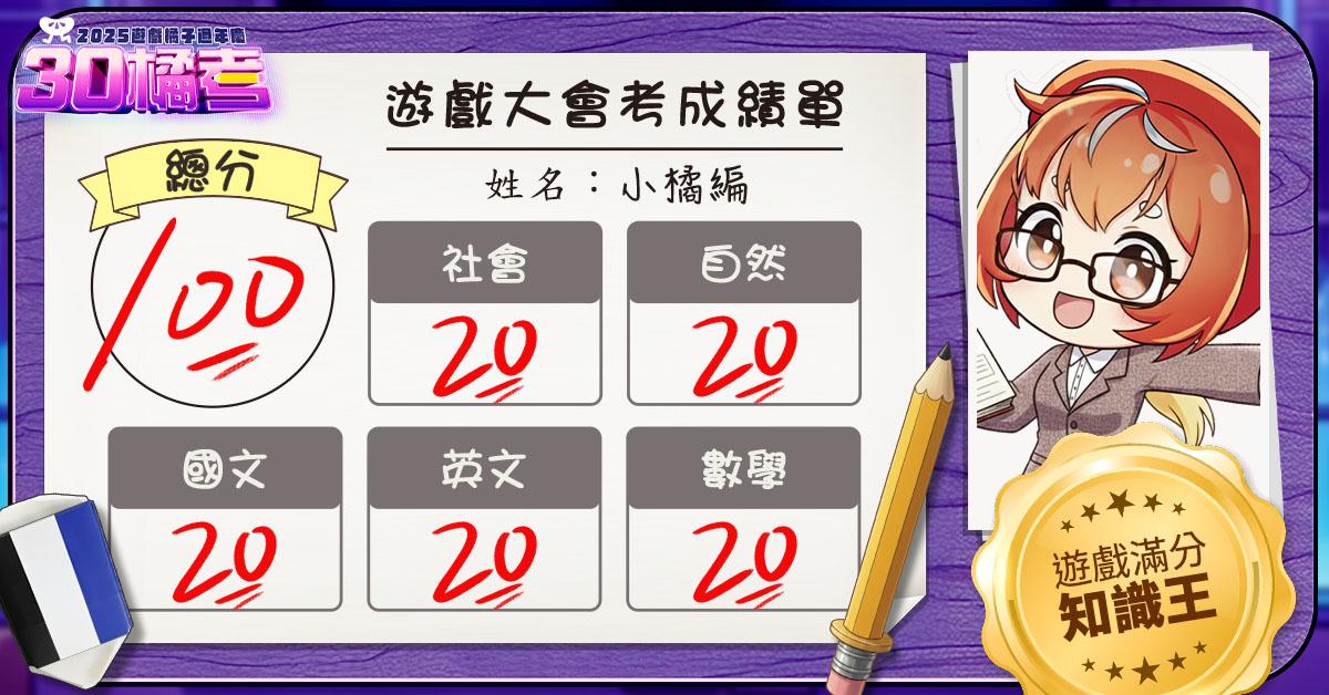 遊戲橘子超有梗「30橘考 遊戲大會考」正式開考!會考題庫不走制式套路,而是從遊戲世界中下手出題!本次以旗下《新楓之谷》、《天堂M》、《天堂》、《CSO絕對武力》、《新瑪奇》、《波拉西亞戰記》、《新龍之谷》、《艾爾之光》、《救世者之樹M》等多款人氣端、手遊作為考場,並特別加入遊戲橘子自有經典IP《便利商店》考場,重現1999年懷舊原作。題目巧妙融入各遊戲角色設定、世界觀、經典場景與玩法冷知識,橫跨國文、英文、數學、自然、社會五大領域,既燒腦又戳中回憶。考生可透過遊戲橘子官方Facebook聊天機器人輕鬆作答,完成測驗將獲得專屬電子成績單,不僅為遊戲旅程留下紀念,亦可勇闖高分榜、挑戰「滿分遊戲知識王」的榮耀寶座!