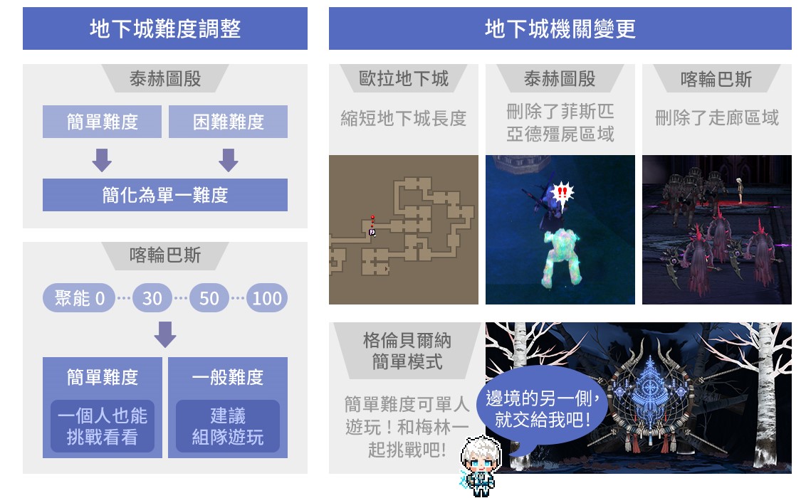 本次改版全面優化地下城體驗,縮短並調整動線、刪除關卡數量與下調難度,通關耗費的時間精簡至多一半以上。當中,「歐拉地下城」困難模式取消通行證限制,降低入場門檻;「泰赫圖殷地下城」則移除每週闖關次數上限,並因應之,官方導入全新「涅亞爾系統」,凡使用「涅亞爾」通關即可獲得高階道具;「格倫貝爾納」簡單模式開放單人挑戰,可攜手NPC梅林輕鬆攻略;部分地下城更新增「直接獲得成品裝備」的機制,讓挑戰更加流暢且具策略性。