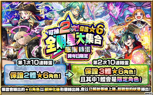 首先是「可抽2次!保證★6全明星大集合感謝轉蛋〜跨年日限定〜」!只有10連一種轉蛋方式,「第1次10連轉蛋」保證最少會出現2體★6角色,「第2次10連轉蛋」更保證最少會出現3體★6角色,並且當中有1體必定是限定角色!