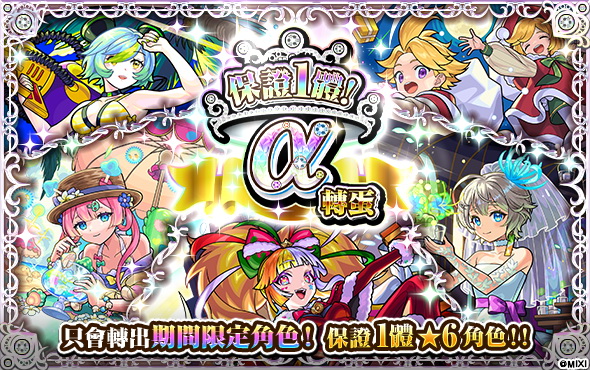 「保證1體!α轉蛋」為只會轉出期間限定角色的特別轉蛋,並保證1體是★6角色!只有10連方式,每人僅限抽一次。