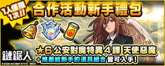 購買「動畫《鏈鋸人》第2彈 合作活動新手禮包」,就能以運氣5&等級「極」&「+值」MAX狀態獲得「公安對魔特異4課 天使惡魔(★6)」。此外,還能獲得任選鈴及體力罐等推薦給新手的道具組合!「公安對魔特異4課 天使惡魔」只能透過合作活動新手禮包入手,每人限購1次!此外可獲得第1彈合作活動角色「公安對魔特異4課領導者 真紀真(★6)」的合作活動新手禮包也會再度登場!