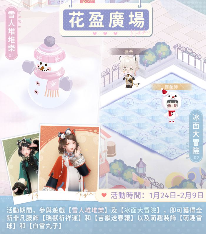 1月24日至2月9日,玩家在花盈廣場參與遊戲「雪人堆堆樂」及「冰面大冒險」,收集兌換道具「冰嵐之章」,即可前往「奇妙禮品屋」兌換非凡服飾「瑞獸祈祥運」及「吉獸送春報」。玩家參與「雪人堆堆樂」還可累積全服積分,積分達指定要求後,即可領取豐厚獎勵,含萌趣服飾白雪丸子、萌趣雪球等。