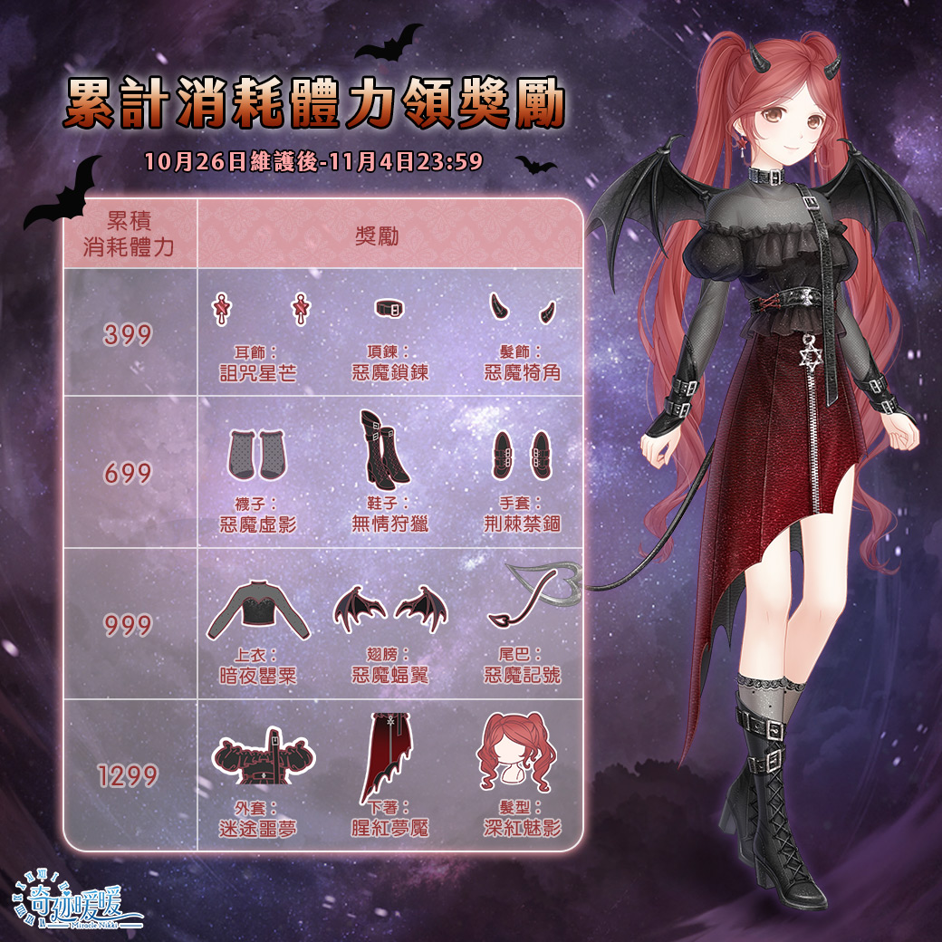 本次更新後,《奇迹暖暖》推出「奇迹大陸的Trick or Treat」活動,即日起至11月4日止,搭配師只要累計消耗體力達指定數量,即可免費領取小惡魔套裝「詭夜惡魔」。此外,搭配師在活動期間內登入遊戲,還可領取萬聖節主題散件「密林來客」、「飄浮幽靈」與「詭異木乃伊」,邀請搭配師們參與活動享受萬聖節!