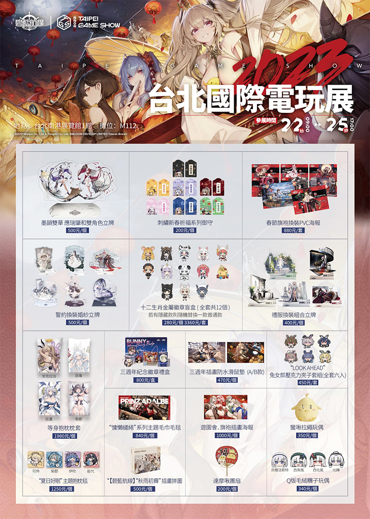 《碧藍航線》官方本次也於台北電玩展期間開設了遊戲主題限定周邊販售區,提供指揮官盡情選購,其中包括各種台灣首次販售的新品周邊,如2023新年Q版立體桌曆、安克拉治等身抱枕等,更有備受期待的春節主題系列周邊同步上架!本次現場設置限量扭蛋抽獎,指揮官們有機會用150元就把價值1980元的等身抱枕帶回家!各種好康福利啾在 2023 台北國際電玩展《碧藍航線》攤位!