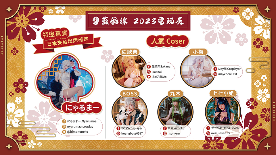 除了以上豐富的攤位常駐活動外,指揮官們最期待的舞台活動更是福利滿滿!本次《碧藍航線》攤位不僅邀請到台灣人氣Coser「佐歌奈」、「May梅」、「Boss」、「九木」及「七七小姐」將與指揮官們在縣在玩遊戲互動,本次更是安排重磅嘉賓「にゃるまー。」的專場訪問活動!