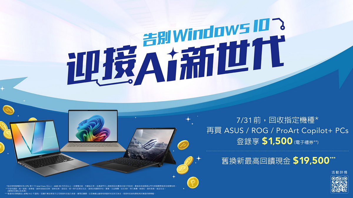告別Windows 10,迎接 AI 新世代!華碩推出多款Copilot+ PC優惠,7月底前,回收指定機種[1] 舊換新最高回饋現金NT$19,500[2],購買 ASUS / ROG / ProArt Copilot+ PCs,登錄送NT$1,500電子禮券,輕鬆換機無負擔,擁抱Windows 11更直覺且智慧的功能,體驗最新 AI 應用,讓工作與生活更加高效,提升防護層級,確保更安全的運行環境!