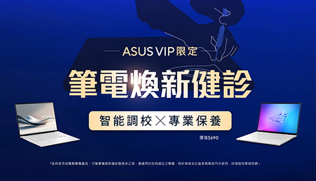 華碩VIP會員權益更新[1]!8月1日起,購買並註冊華碩家用或電競筆電之會員,即可獲得筆電煥新健診服務(會員註冊後mail通知) 。2024年3月1日至2025年7月31日期間已註冊會員,亦享有同等福利(系統統一mail發券)。筆電煥新健診服務內容包含:硬體功能檢測、散熱溫度檢測、筆電基本清潔,完成健診服務的用戶,將會獲得個人筆電健診報告,讓筆電效能保持在最佳狀態。