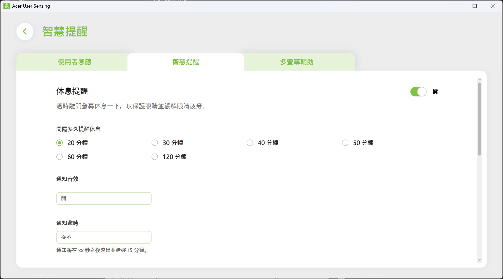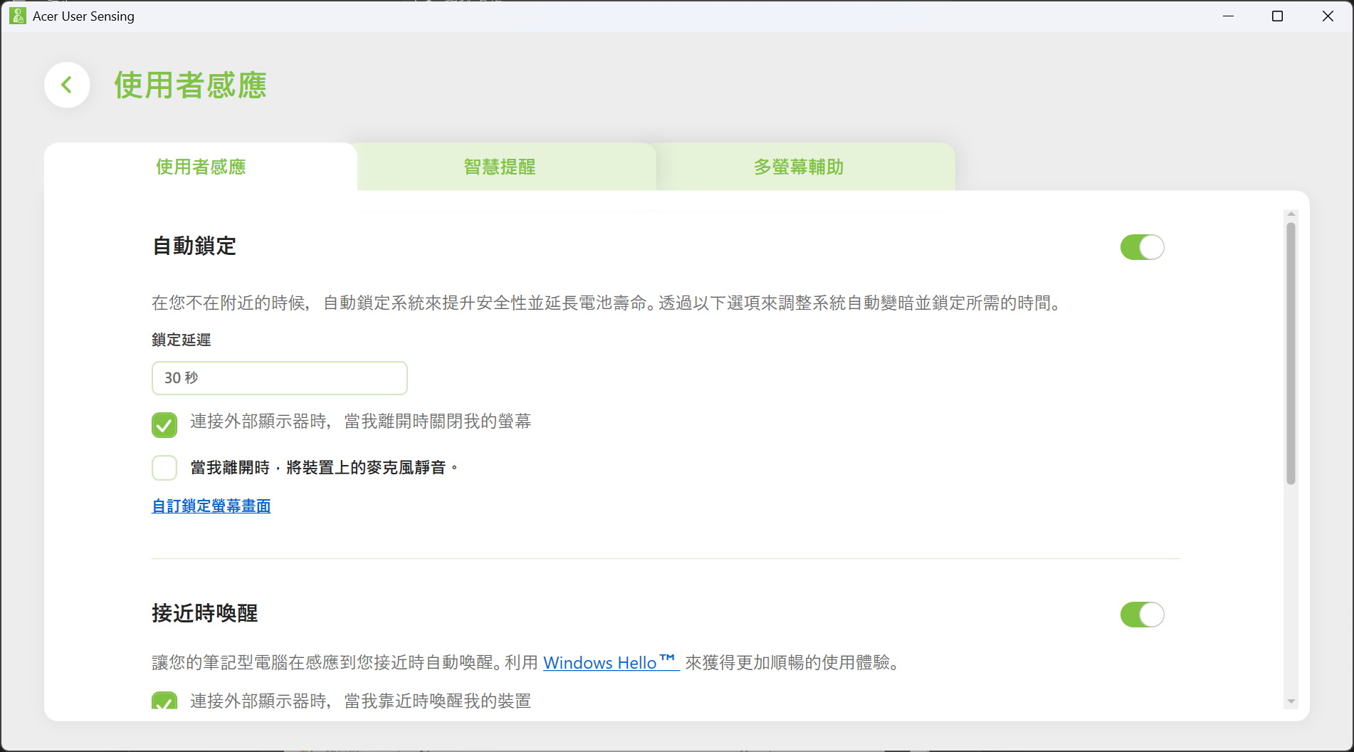 ▼ Acer User Sensing使用者感測技術,配合Windows Hello人臉辨識技術,可透過鏡頭自動偵測你與筆電的距離,在離開電腦時鎖定螢幕,以保護私隱和節省電池電量,並在感測到你返回使用時自動喚醒,同時提供休息提醒及螢幕距離提醒。