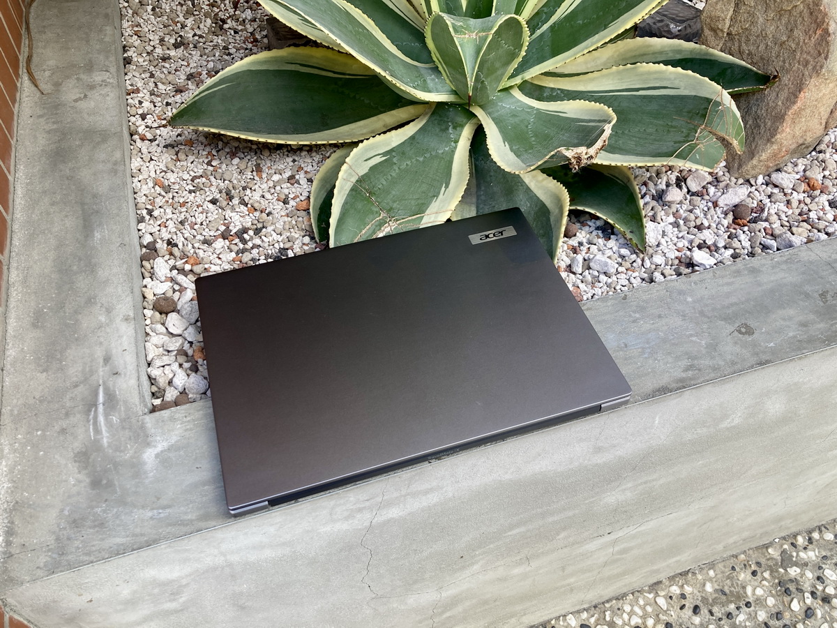 外觀中規中矩延續過往Travelmate商務幾種風格,採用鋁鎂合金材質,灰藍光澤磨砂金屬霧面質感。整體設計簡約沉穩,全機身以金屬深灰色為主,打造出滿滿的專業商務感。上蓋右上方Acer Logo金屬亮面銘牌,通過軍規標準(MIL-STD-810H)。機身輕盈1.31Kg且薄15.9mm,窄邊框螢幕支援180度攤平,兼顧輕薄耐用,採用消費後回收塑料(PCR)及海洋回收塑膠所製成,打造100%無塑膠且可回收的產品包材,以減少碳足跡,且已獲得TCO認證及 EPEAT註冊和環保標章。