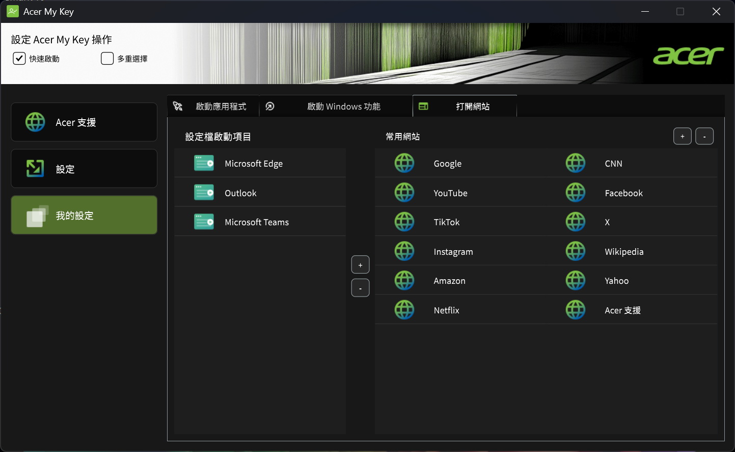 ▼ 內建全新「Acer My Key」快捷鍵,可一鍵開啟一系列預設的應用程式,讓你可自訂常用軟體與工作流程,透過單一按鍵迅速啟動多個應用程式或是網頁,大幅提升工作效率,方便快速切換不同工作場景。