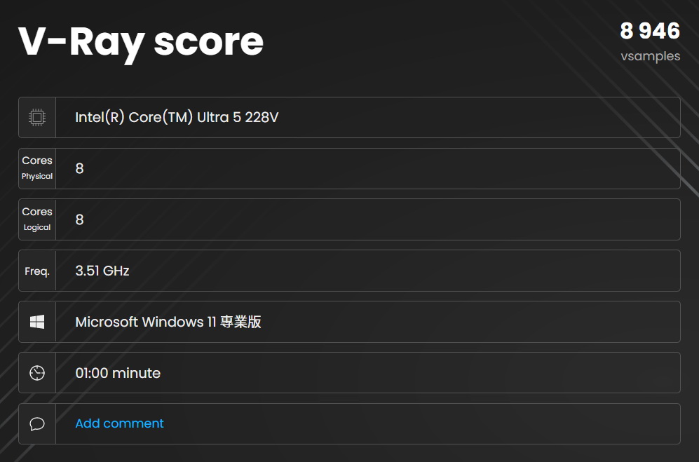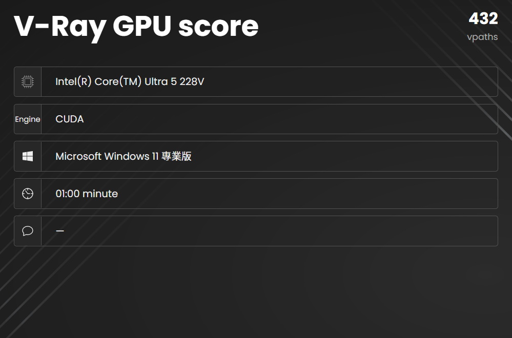 ▼ V-Ray benchmark CPU效能跑分8,946分,GPU CUDA 跑分432。