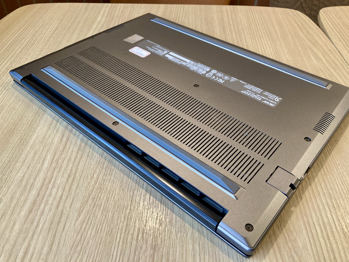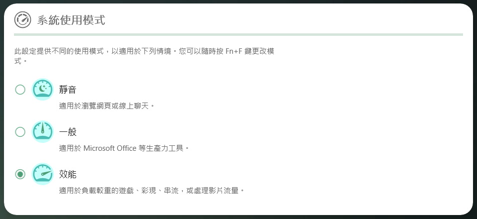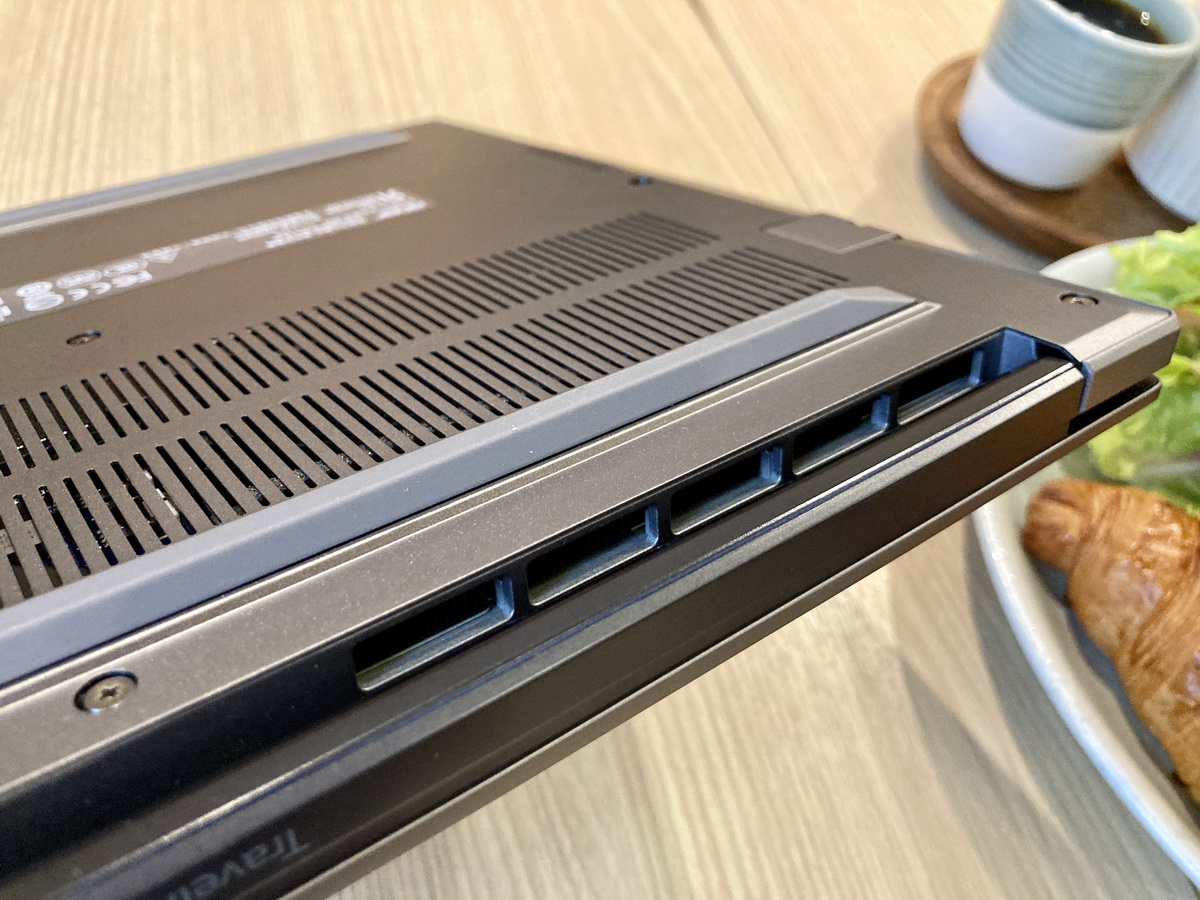 ▼ 筆電底部(D面)大面積的散熱進風口,機身後側單邊設置散熱出風口,可以透過 Fn + F 選擇冷卻模式:靜音、一般及效能,實測即使在效能模式下,風扇也不至於太吵,長時間使用鍵盤並不會有發燙的感覺。