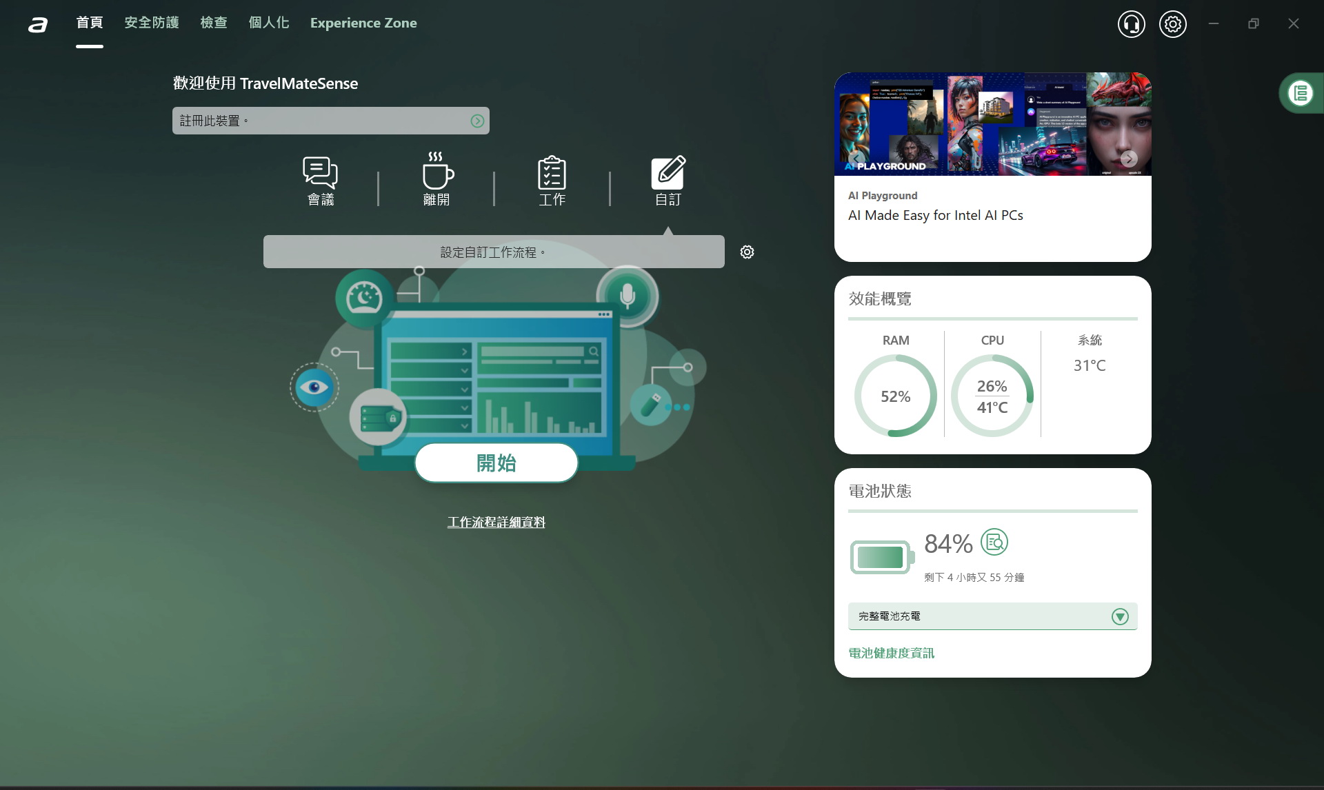 ▼ TravelMateSense系統工具,首頁提供工作情境快速設定,方便即時管理系統狀態、存取Acer應用程式。
