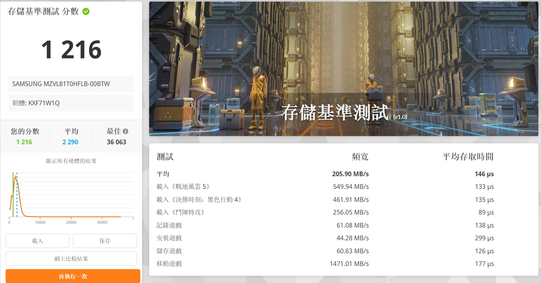 ▼ 3DMARK儲存基準測試,平均頻寬205.90MB/s,平均存取時間146µs,評分1,216分。