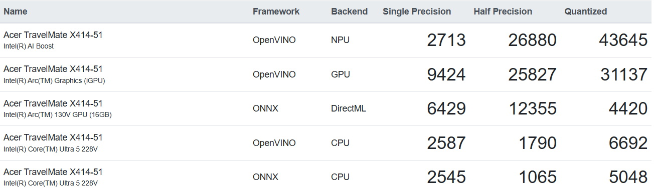 在OpenVINO架構NPU跑分,Single Precision Score 2,713、Half Precision Score 26,880、Quantized Score 43,645
