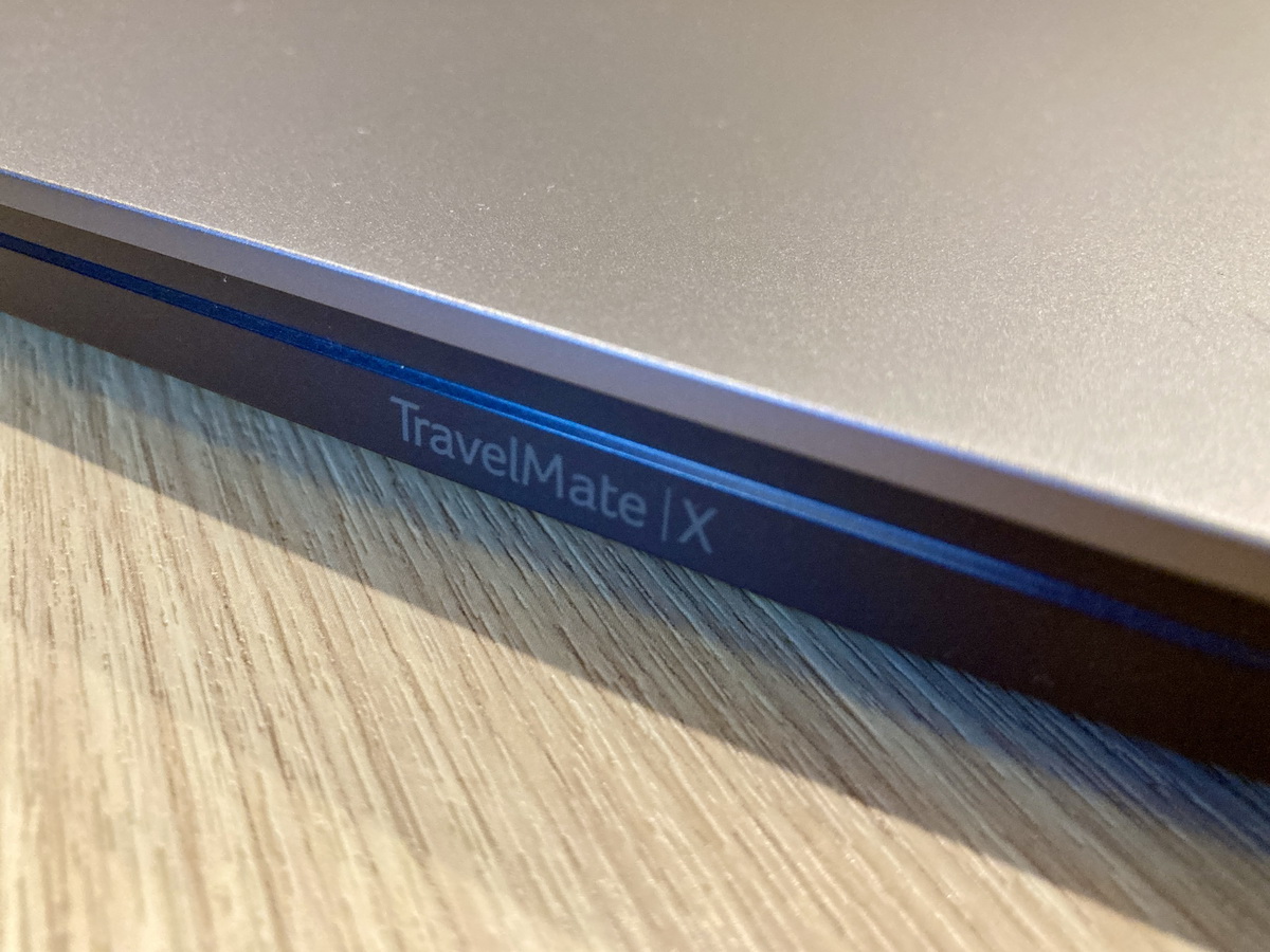▼ 筆電上蓋右上角acer LOGO金屬銘牌,後側Travelmate | X系列標誌 。
