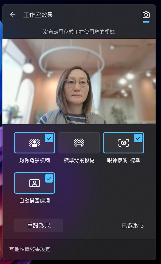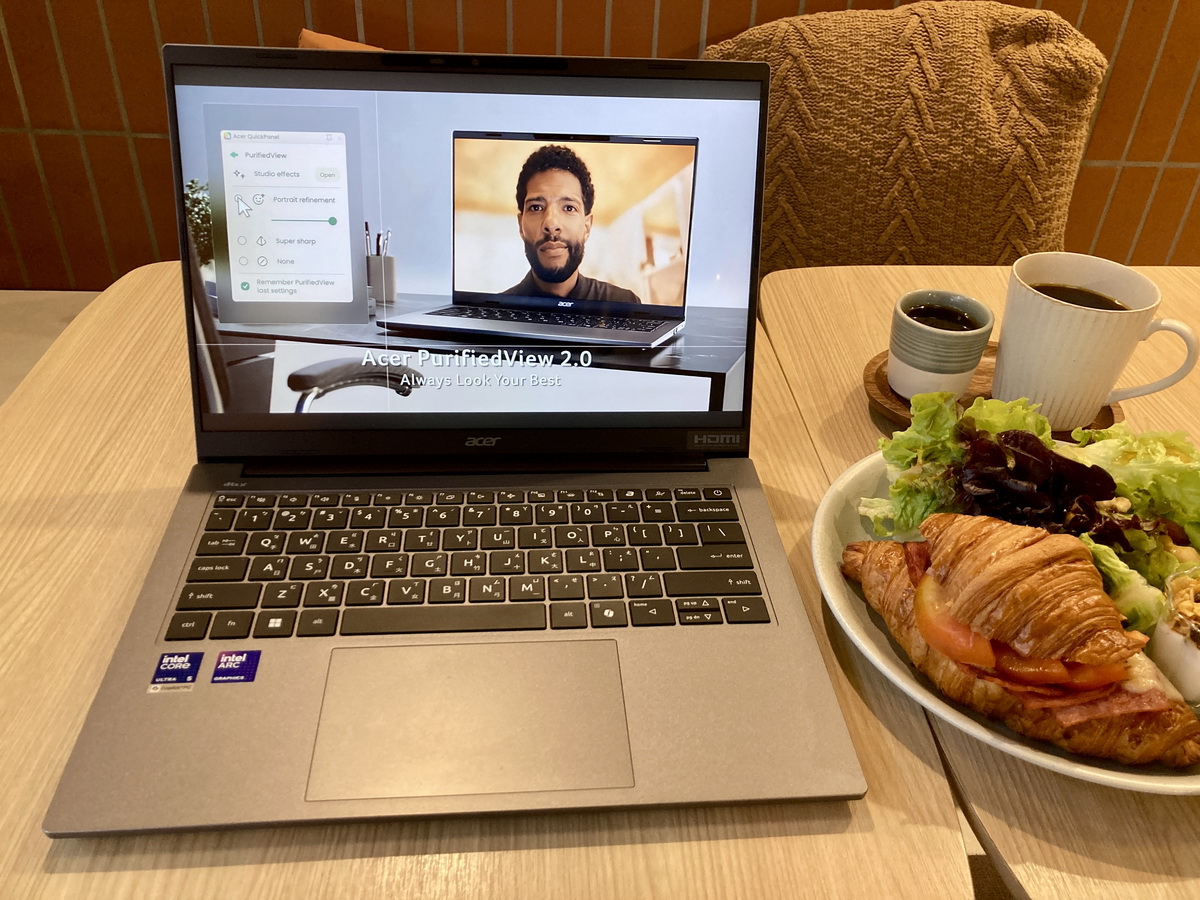 ▼ Acer PurifiedView AI智能視訊技術,及Windows工作室效果設定,可支援背景效果、自動構圖處理和眼神接觸,增強視訊通話效果。Acer QuickPanel提供「人像精細化」與「超銳利」兩種功能的效果。