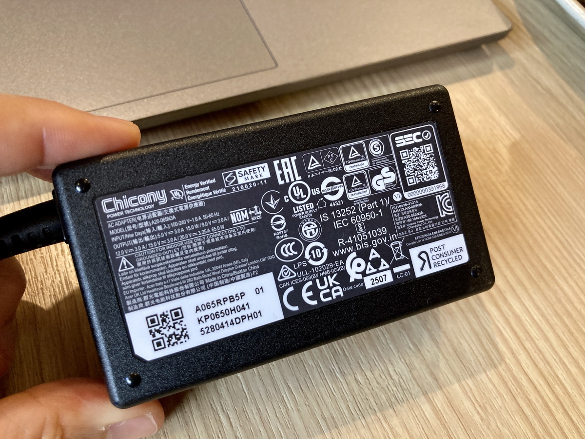 ▼ 實測機身重量約1.239 公斤,配備群光USB-C 65W電源變壓器,電源供應器+電源線重量約0.314公斤,全帶出門約1.5公斤,輕薄設計符合行動商務使用。