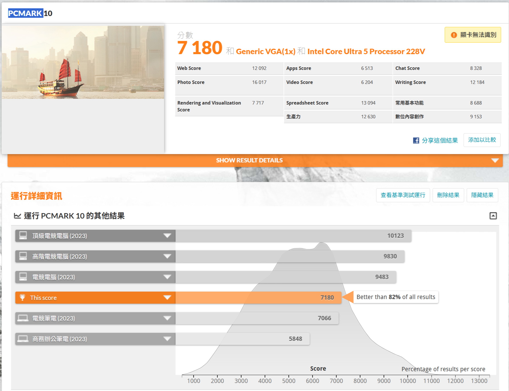▼ PCMARK 10跑分7,180,排名82%。
