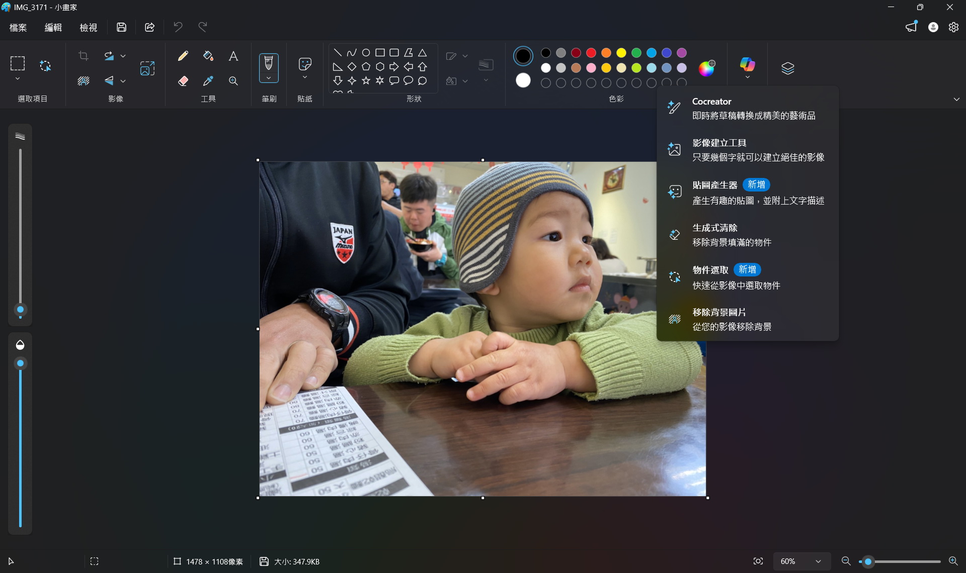 ▼ 小畫家功能強大,包含影像建立工具,貼圖產生器,生成式清除,物件選取,移除背景圖片等。