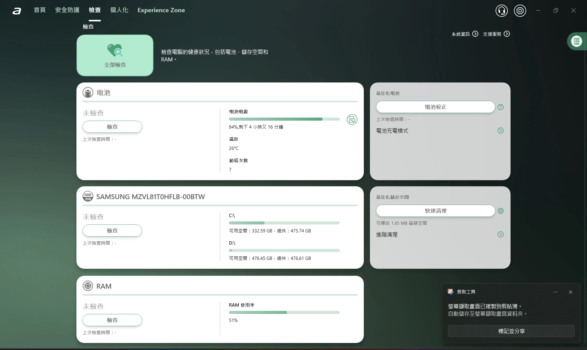 ▼ TravelMateSense檢查設定,提供完整的電腦系統資訊、檢查、效能優化、更新與備份還原,讓裝置保持最新狀態,順暢運作。