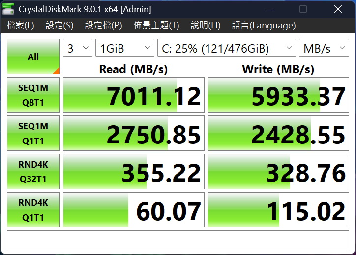 ▼ CrystalDiskMark進行SSD測試,可以看到讀寫速度為7011.12MB/s與5933.37 MB/s。AS SSD Benchmark進行SSD測試,讀寫速度為5051.90MB/s與3304.55MB/s。獲得綜合評分2,514。