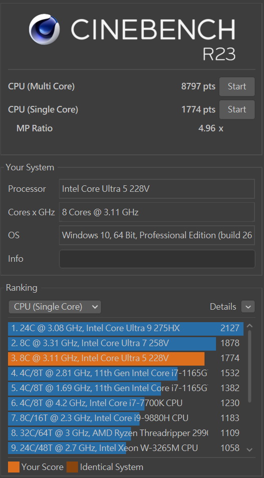 ▼ Cinebench R23 進行CPU測試,單核測試中獲得 1,774pts,在多核測試中獲得 8,797pts,MP Ratio︰4.96x。Cinebench 2024 進行CPU測試,單核測試中獲得 113pts,在多核測試中獲得 555pts,MP Ratio︰4.92x。Cinebench 2026 進行CPU測試,Single Threads測試中獲得 4424pts,在Multiple Threads測試中獲得 2,028pts,MP Ratio︰4.59x。