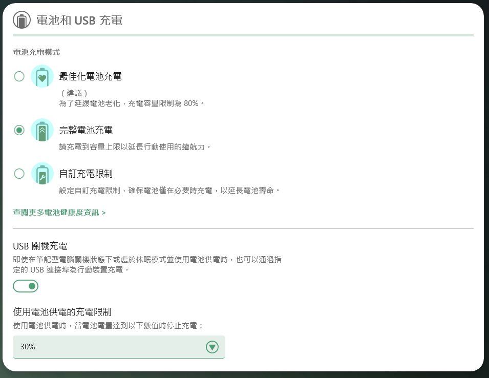 ▼ TravelMateSense個人化設定,提供系統使用模式選擇,電池及USB充電設定。