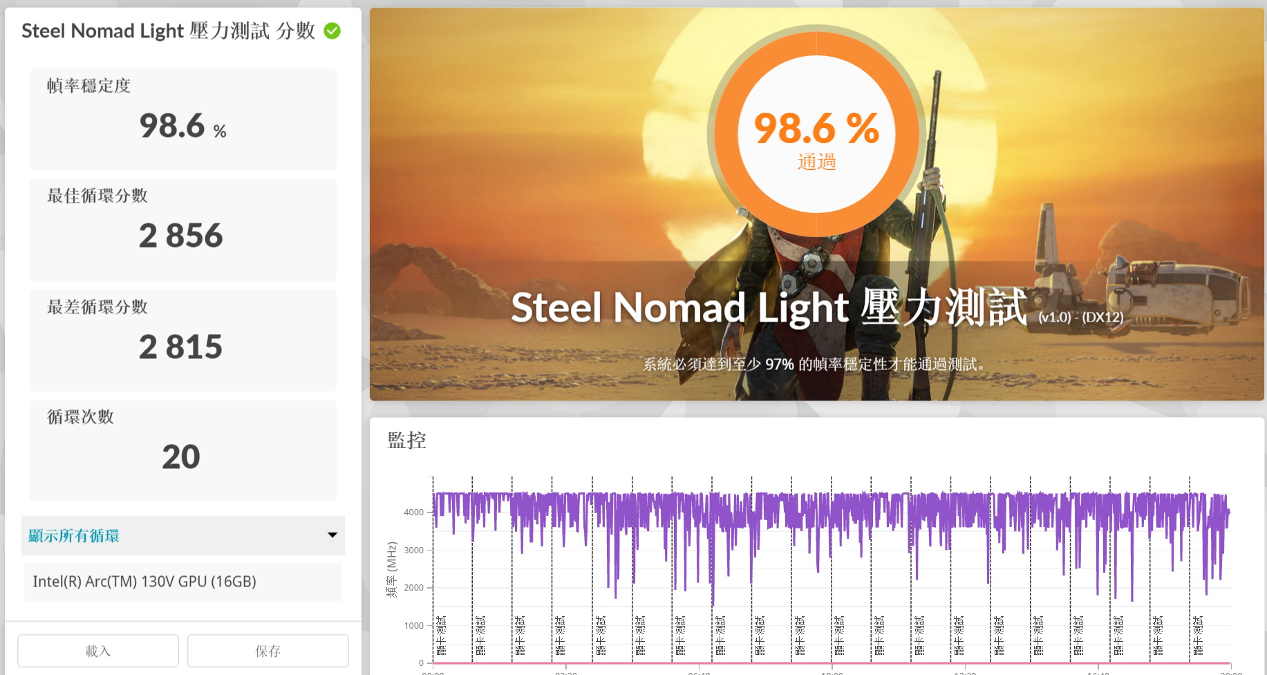 ▼ 使用3DMARK Steel Nomad Light測試顯卡跑分2,848分, 壓力測試98.6%PASSED。