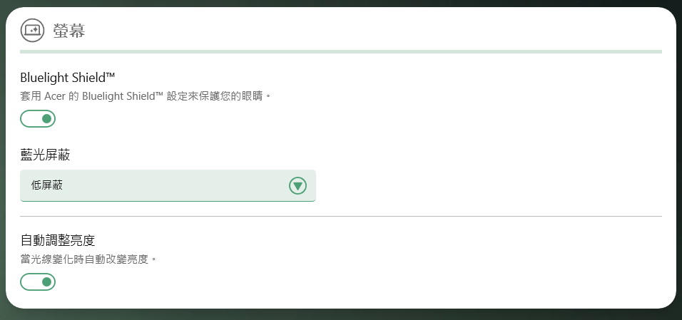 ▼ 可透過TravelMateSense個人化設定,套用Bluelight Shield設定來保護眼睛,共有中高低屏蔽及長時模式四種可選擇,也可開啟自動調整亮度,當光線變化時自動改變螢幕亮度。