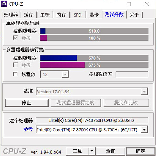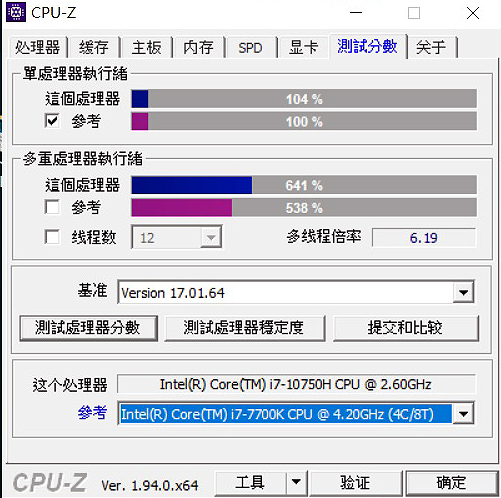 經測試跑分,Core i7-10750H單核分數來到 510分,多核心則達3140分(僅供參考),效能表現頗為出色,並超越英特爾先前評價高的Core i7-7700K,代表執行多工處理具優勢,提供更優的系統超頻性,大可因應玩遊戲或內容創作需求。