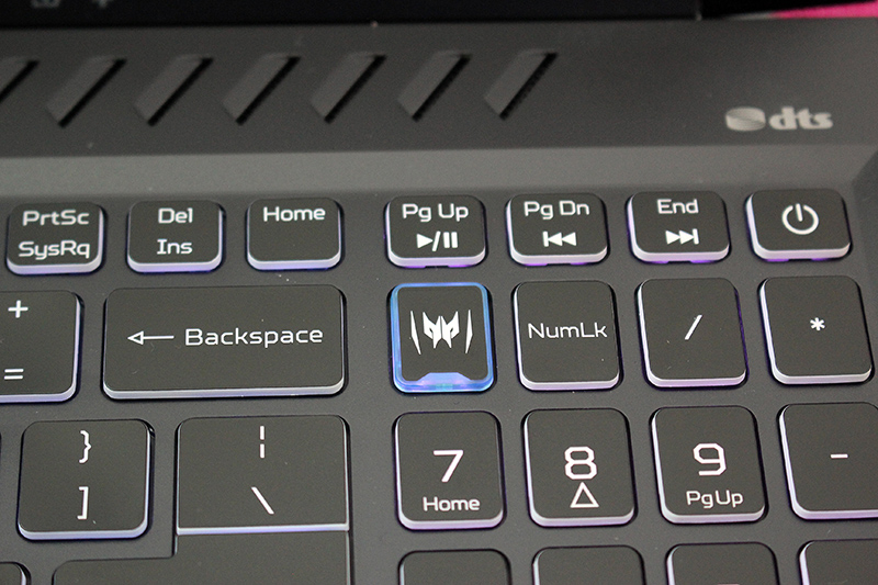 此外鍵盤同上代,特別針對遊戲玩家常用的四顆「WASD按鍵」,以及右側邊上下左右四顆「方向鍵」與「Predator Sense快捷鍵」,貼心採用半透明藍色調材質,讓鍵盤下方燈光能更滲透出來,有助於視覺辨識與按壓掌握;同時採用含數字鍵全尺寸鍵盤,搭配框有金邊的大型觸控板規劃。