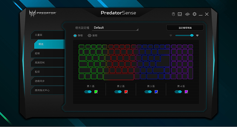 尤其鍵盤部分,配置很電競吸睛風格的四區域1680萬RGB燈效,支援可自定義燈色,尤其運作時鍵盤映射出帶點朦朧光暈多彩燈色,在昏暗環境下顯得相當有氣氛。