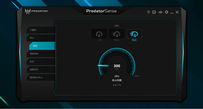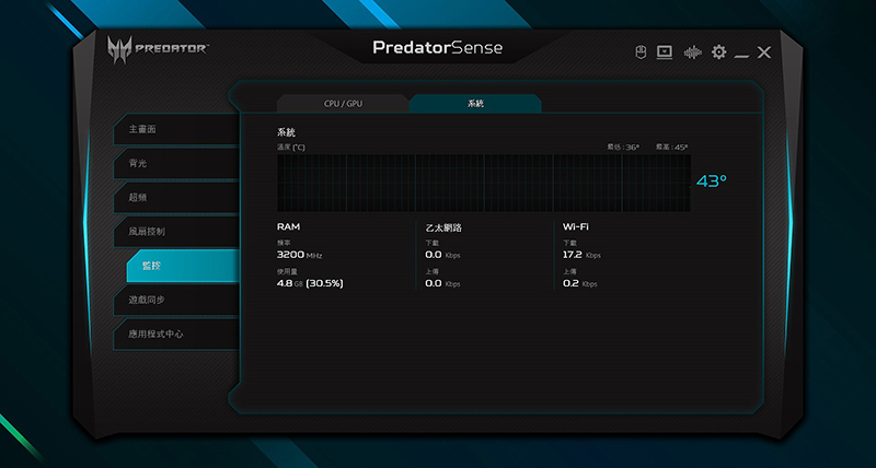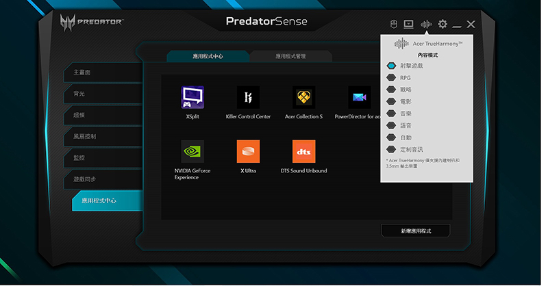當然新Predator Helios 300同樣提供Predator系列標配「Predator Sense監控調校整合軟體」,這界面經過幾代磨合後做到相當成熟完善,讓玩家能很直覺查看系統各資訊,包含CPU/GPU/系統溫度、風扇轉速控制、開啟超頻控制、各項數據&有線/WiFi網路監控,並能透過軟體快速設定RGB區域燈光以及做DTS:X Ultra Audio音效設定,快速切換不同音場優化模式。