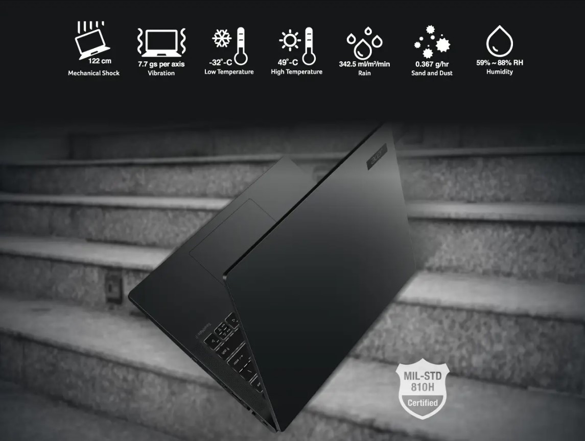 軍規外殼設計,結合MIL-STD 810H軍規等級的耐用性、Corning®Gorilla®Glass觸控面板,打造出高效能專業商用筆電,日常磨損與刮傷,甚至讓你就算摔到也不怕。