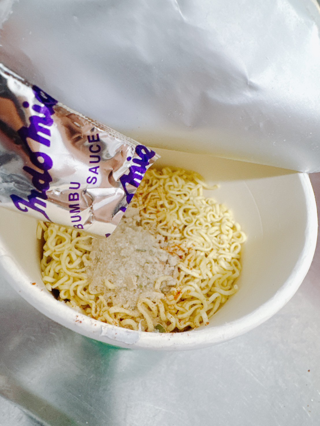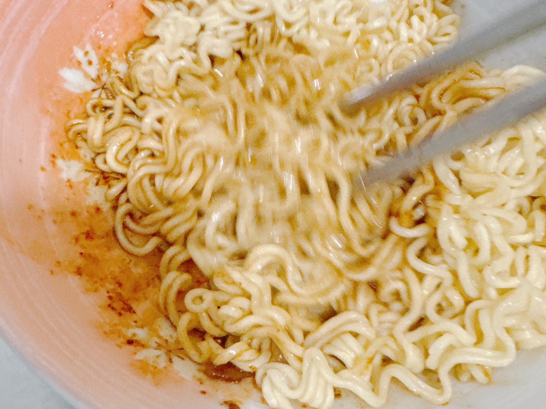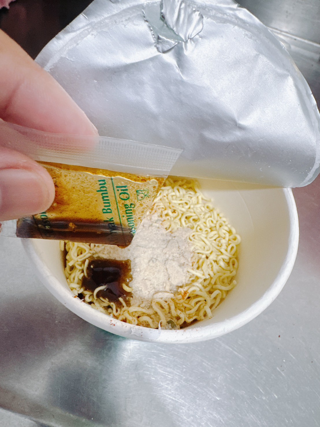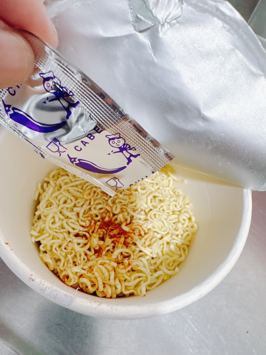 將配料倒入杯麵中,調味包中還是有辣椒粉
