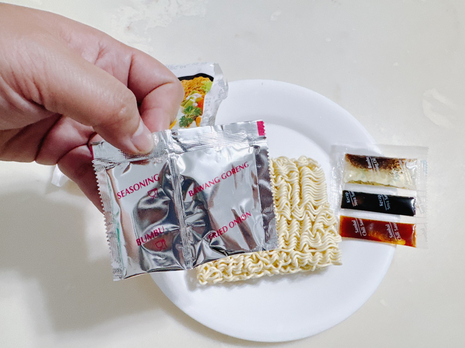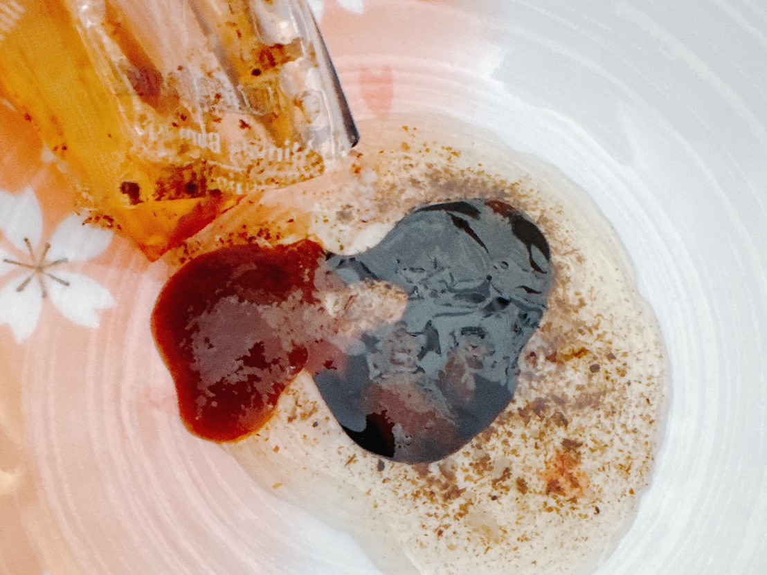 再等待的過程中,將所有得調味包倒入盤子中並攪拌均勻