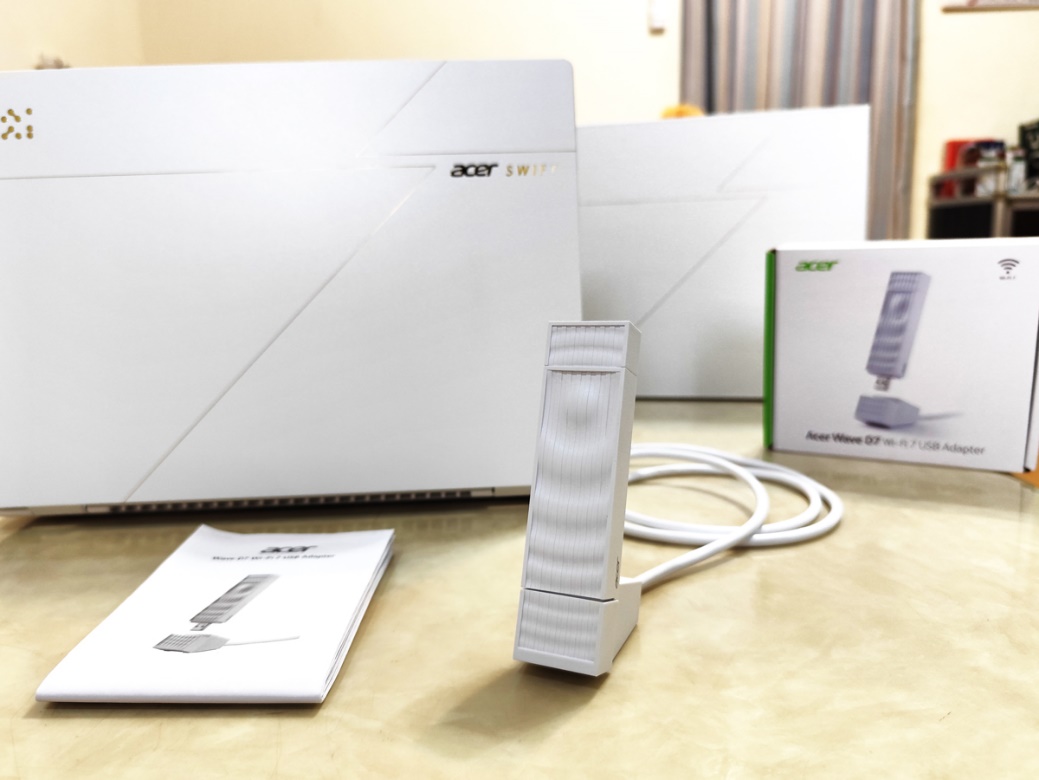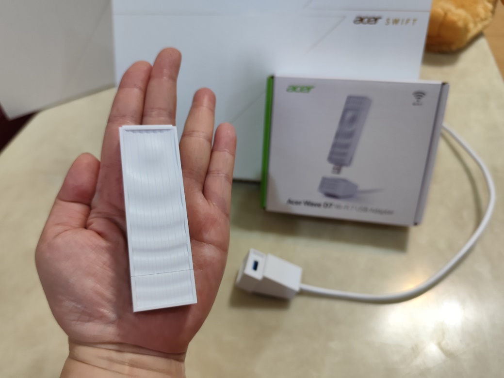 - 內容物:Acer Wave D7 USB 網卡本體(Type-A接頭)、快速安裝指南、延長底座