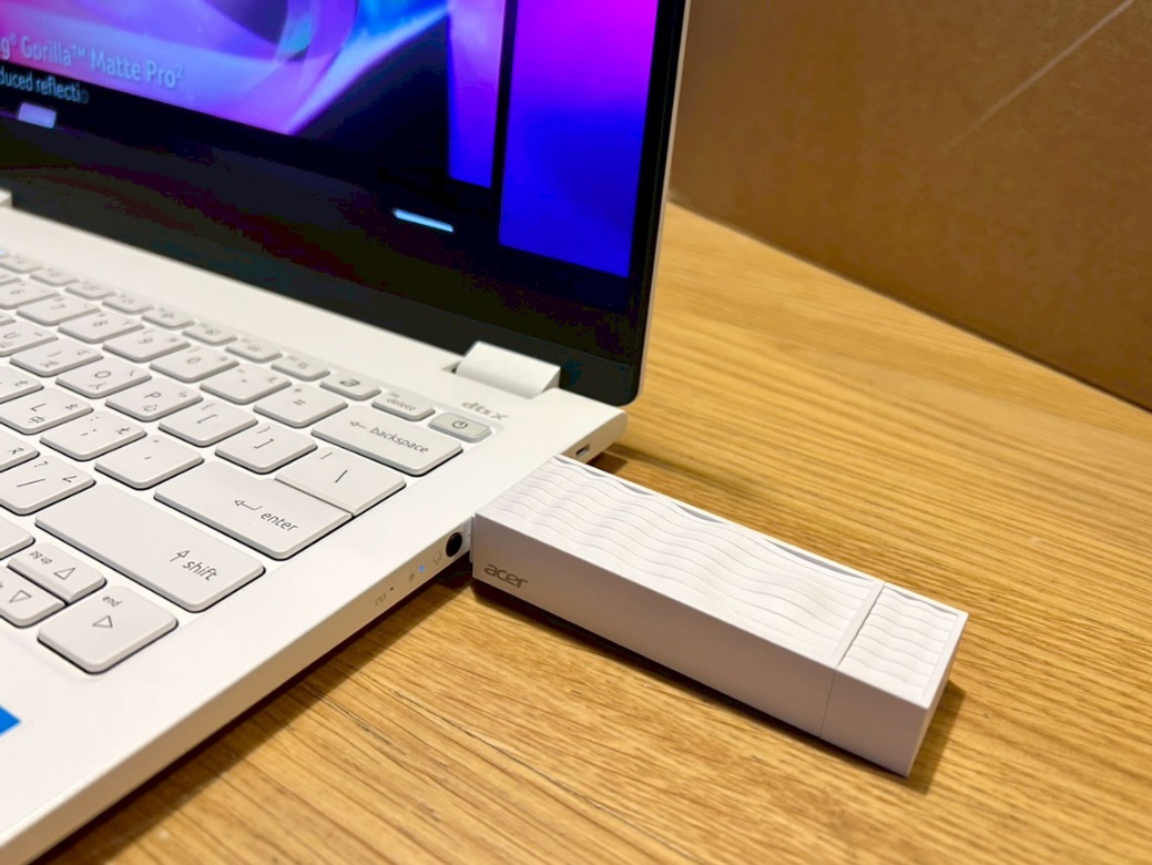 - 本體:Acer Wave D7比打火機大一點,搭配USB Type-A接頭與延長底座,外型簡約俐落,便於攜帶與安裝。