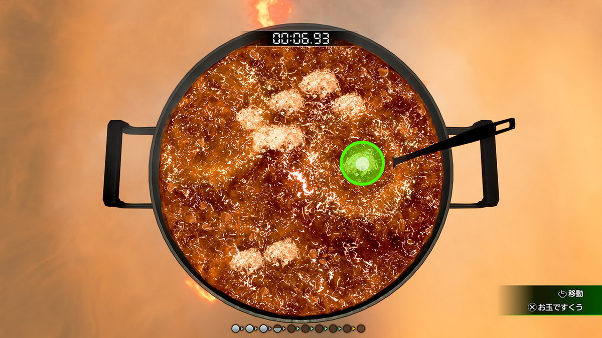 真島擔任主廚!? 製作出頂級料理的吾朗廚房!用探索街道和大海時獲得的食材製作料理吧!根據想製作的料理,透過「生火」、「大秀刀工」和「撈浮渣」等各種不同的烹飪手法,完成的料理會有回復體力或回復熱血量表等效果!