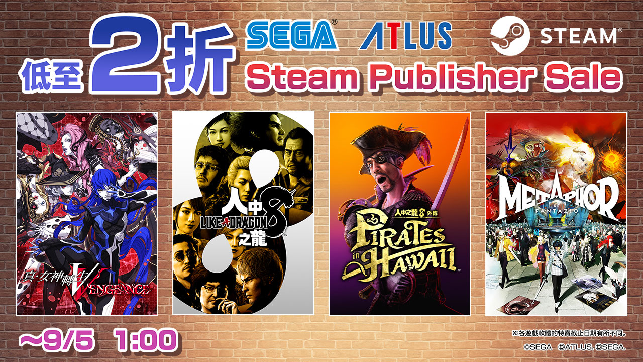 世雅股份有限公司現正舉辦「SEGA Steam Publisher Sale」,於Steam販售的SEGA‧ATLUS部份PC遊戲作品目前限期特價中。