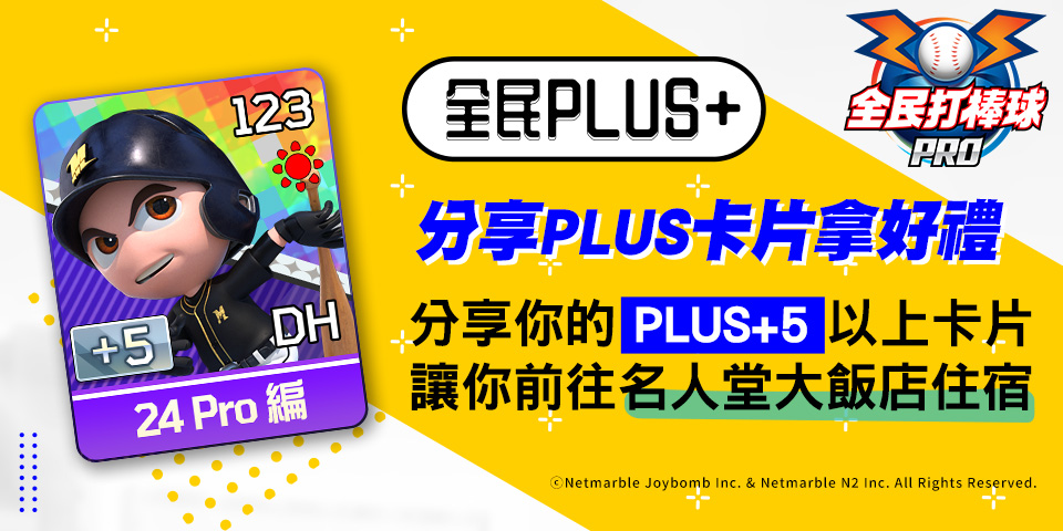此外,官方開啟社群活動「全民普拉斯」,即日起至4月10日上午10點,玩家只需前往臉書粉絲專頁的活動貼文(https://nmn.tw/BBM3_pluspost)留言處,上傳+5(以上) PLUS球員卡面,即有機會獲得「名人堂花園大飯店」住宿折價券、「寶石*1萬」或隨機簽名球等豐富獎勵!進一步的詳細資訊請前往官方粉絲專頁(https://www.facebook.com/twbbm3/)查看。