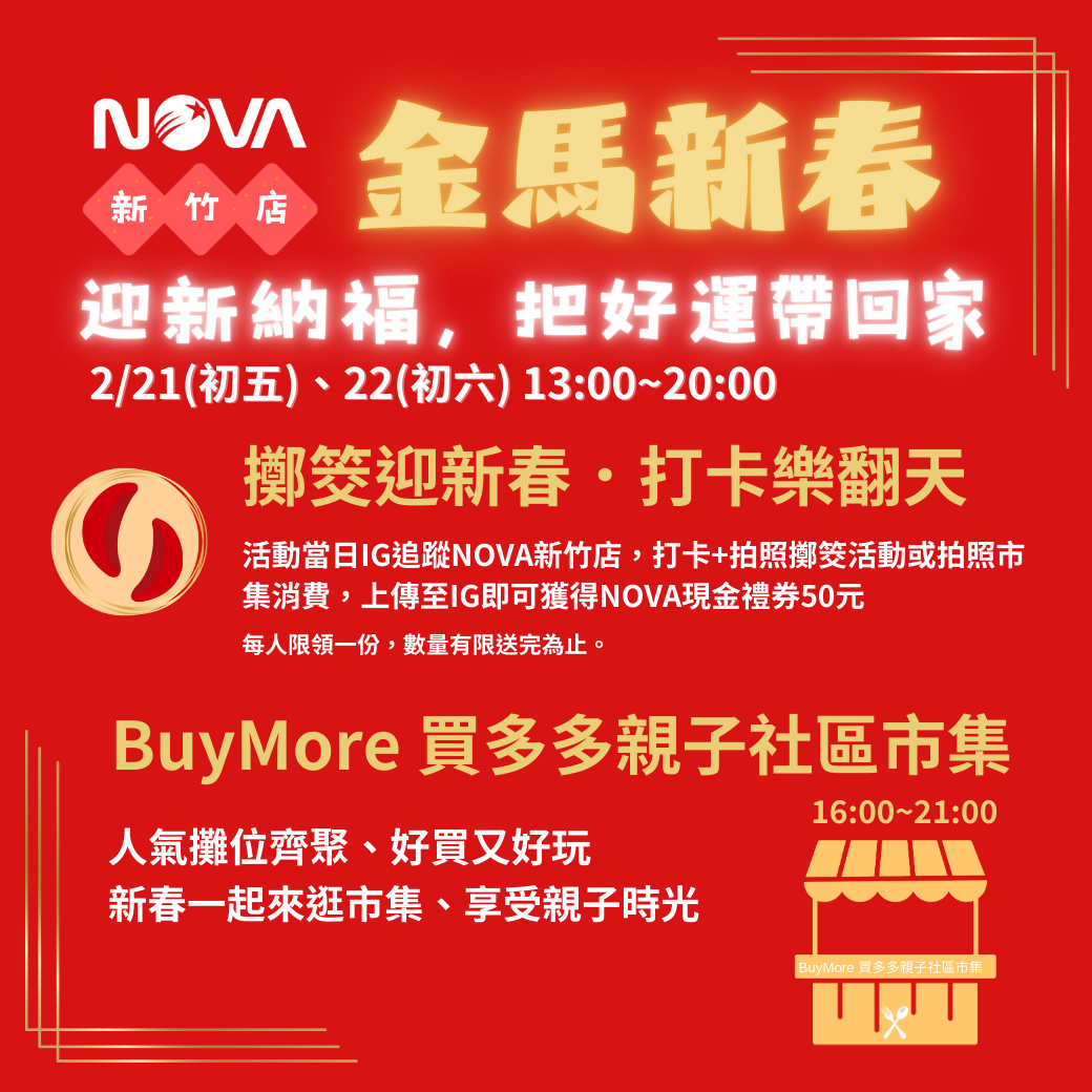 NOVA新竹店 ⾦⾺新春!迎春納福,把好運帶回家2/21(初五)、22(初六) 13:00~20:00擲筊迎新春.打卡樂翻天活動當⽇IG追蹤NOVA新⽵店,打卡+拍照擲筊活動或拍照市集消費,上傳⾄IG即可獲得NOVA現⾦禮券50元每⼈限領⼀份,數量有限送完為⽌。BuyMore 買多多親⼦社區市集⼈氣攤位⿑聚、好買⼜好玩 新春⼀起來逛市集、享受親⼦時光